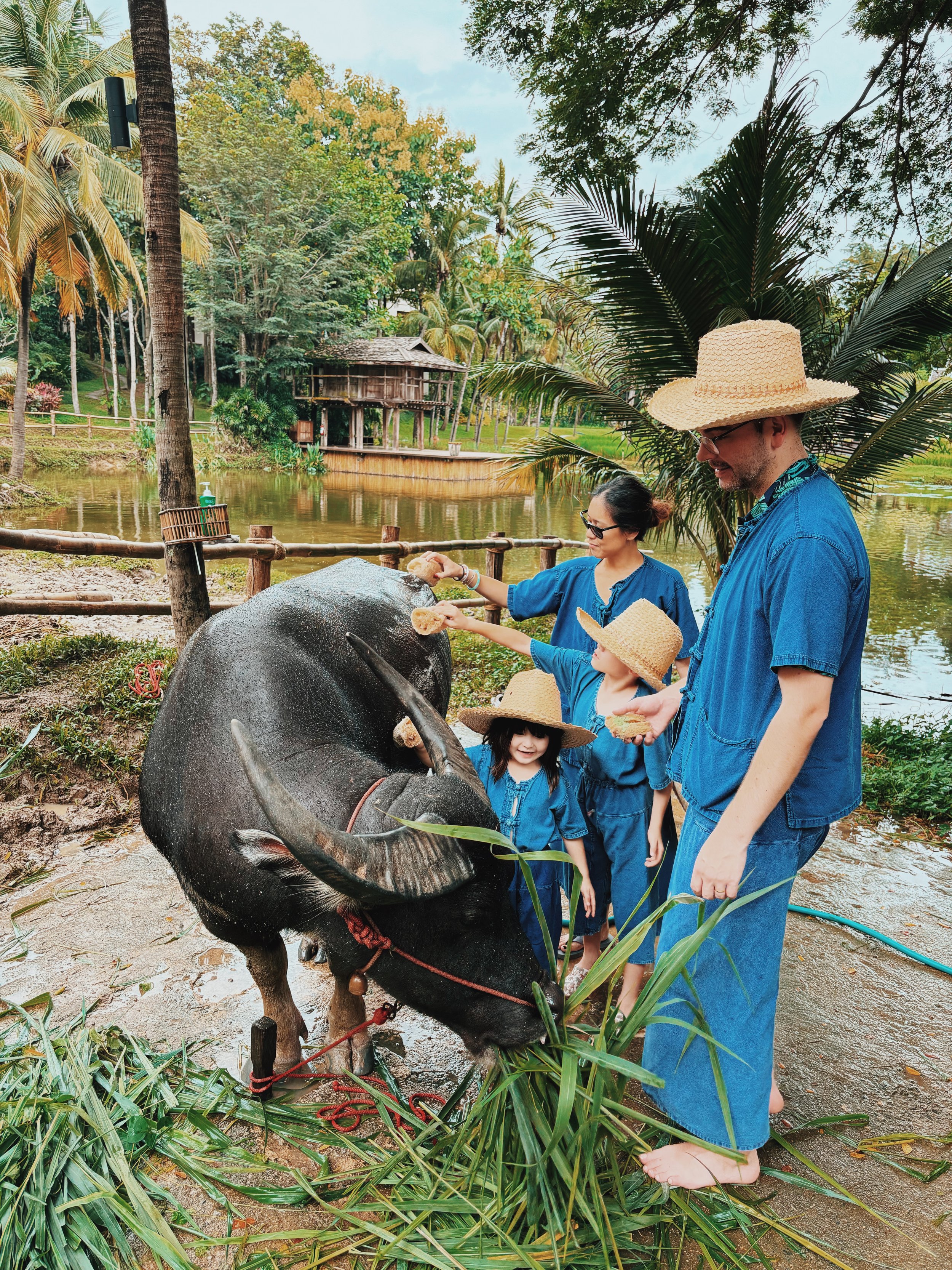 One of the highlights of our stay was participating in the Chaan Baan cultural experiences. These hands-on activities allowed us to connect with the local culture in a fun and meaningful way. We especially loved bathing the resort’s friendly water buffaloes—an experience that delighted our kids and gave us a chance to connect with the animals. For a more creative experience, we tried our hand at natural dyeing using indigo, learning the art of binding and stitching fabric to create intricate patterns.